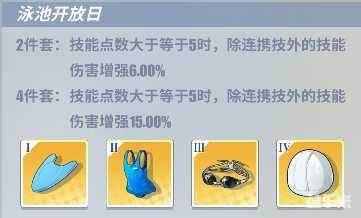 泳装套,是加成伤害最高的套装,但适用范围极小,需要本身有五点以上技能点才能出发,最适用于封技。