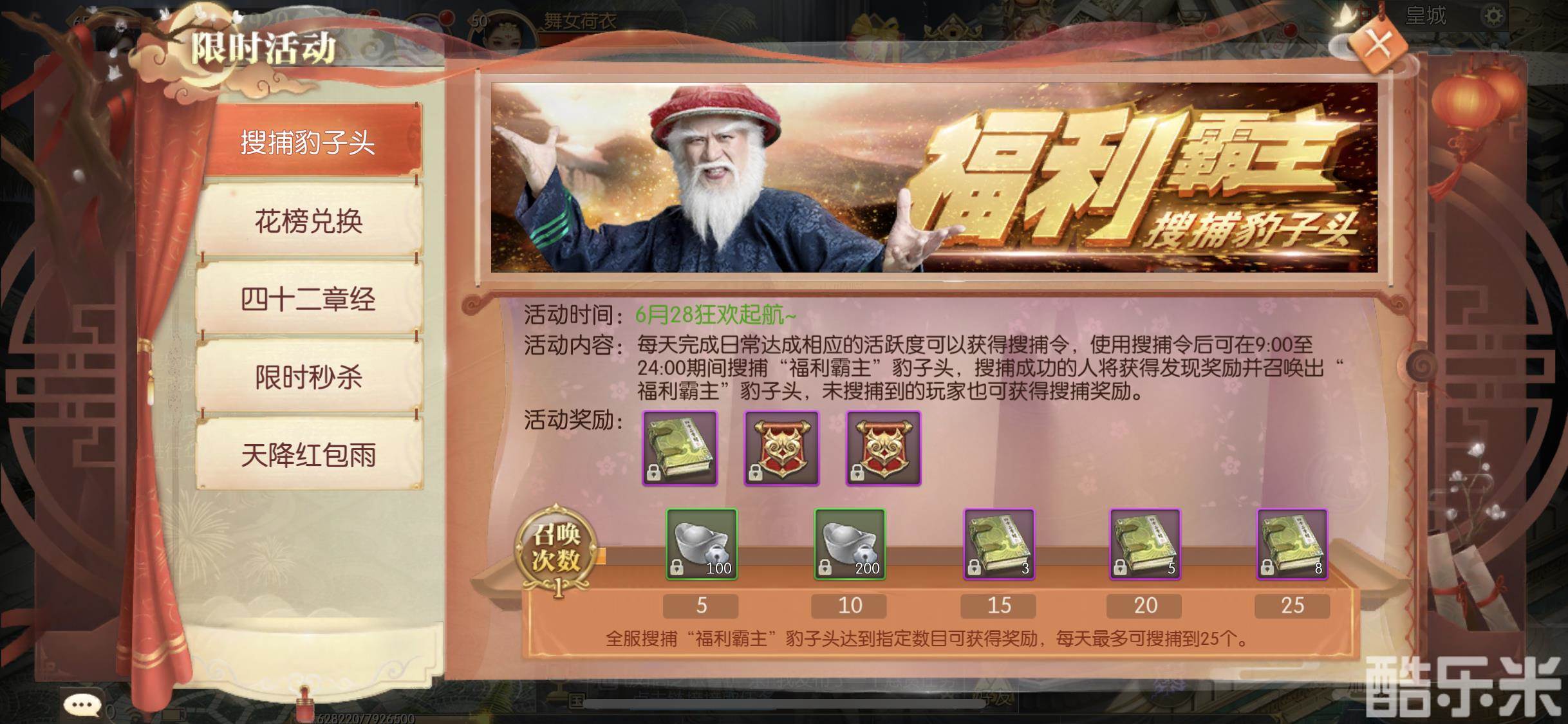 勇士们可以通过每天的日常任务活跃度获得专属道具-搜捕令!每天最多可以使用八次!拥有此道具就可以去追查贪得无厌的京城六扇门第一高手豹子头-雷豹!也就是我们游戏中的“福利霸主”。全服搜捕到“福利霸主”达到一定的数量还可以获得累积次数奖励。