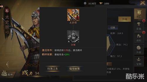 武将还能羁绊属性来提高战斗力,收集符合羁绊关系的武将,从而激活羁绊关系,增加额外属性,也能让武将变强。此外,通过装备来提升属性,装备精良的装备,会让将领如虎添翼。?在资源有限的情况下,最好根据资质和武将技能选出比较合适已方阵容的武将并重点栽培,把资源集中给主力阵容会是比较明智的选择。