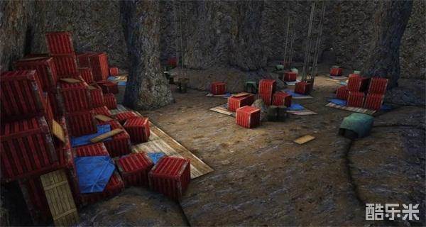 洞穴内的物资遍布在油桶和集装箱上面,而在洞穴中心处,玩家可以看到一个空投箱,那里就是空投物资隐藏处。
