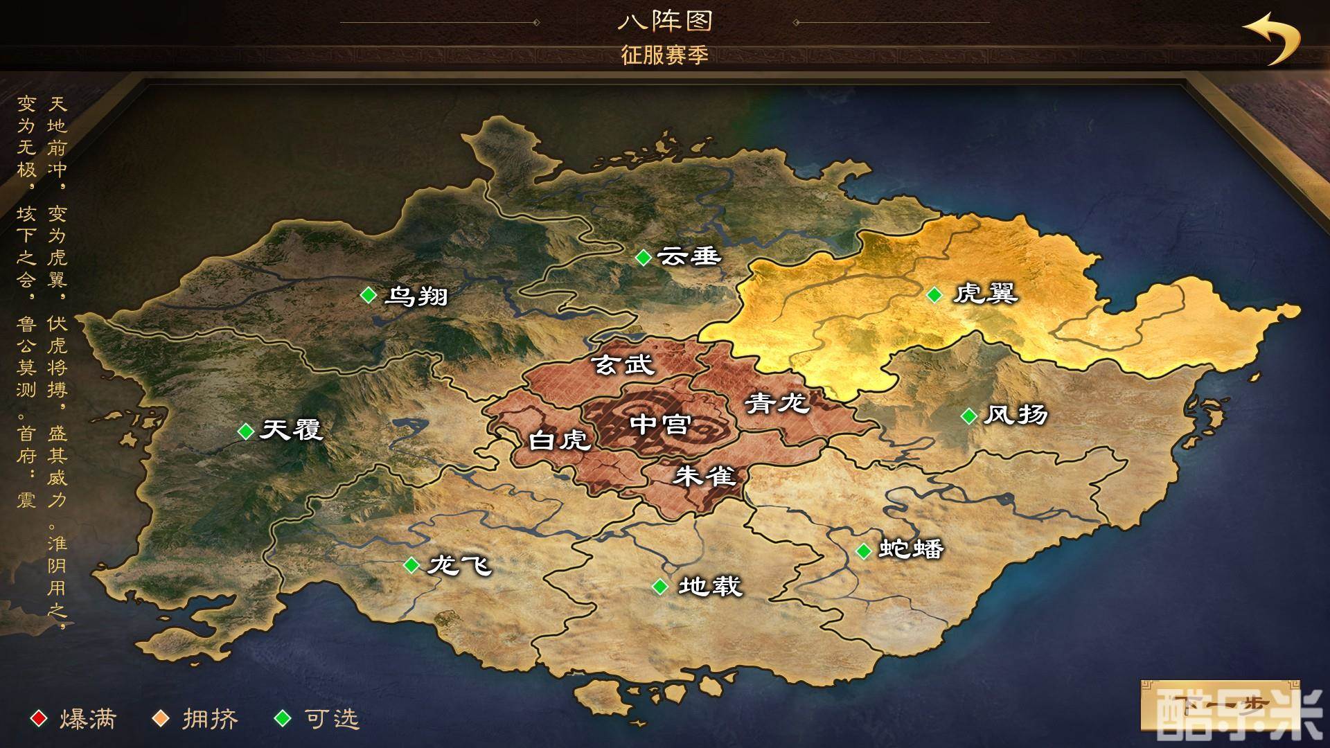 【八阵图】赛季首次推出全新“八阵”地图,并引入战争迷雾等新玩法,同时地图天气变化无常,玩家会在短时间内经历四季,并据此做出战略应对。覆盖全图的迷雾之下,是随机变换的地理和地形,闷头乱撞容易陷入死路;两军对垒时,由于看不清敌方战略部署,探子和线人传来的情报至关重要。八阵图的变幻莫测让玩家的决策更加审慎,谋略与武力的碰撞将会更加激烈。
