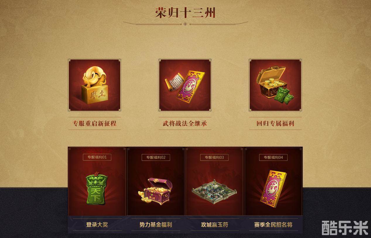 2019年7月3日-10日,截止2019年5月20日前,账号连续30天以上未登录游戏,且角色历史势力值≥1000,即可报名转入S2赛季回归专服。并于7月11日11点回归专服正式开启后,继承原有武将、战法等数据,在S2赛季的回归专服里,与来自五湖四海的老战友齐聚一堂,再次化身一方之主,内掌政务外展军事,体验寸土必争的战争乐趣。此外,S3、征服赛季的老玩家回归角色,进入备战区后除回归服外,还可选择报名其它赛季玩法。