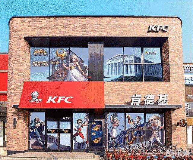 另外,还有经常进行异业合作的品牌主KFC,也曾经联动圣斗士IP,搭建了主题风格店,店内的布置也呈现出大量的星矢元素。
