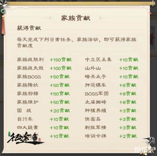 家族是由志同道合的少侠们组成的大家庭,每个成员都应当为家族发光发热,这样才能赢得家族“贡献”,来兑换家族藏宝阁中的秘宝。初入家族,少侠可以通过完成每日的家族任务,积累基础的家族贡献。
