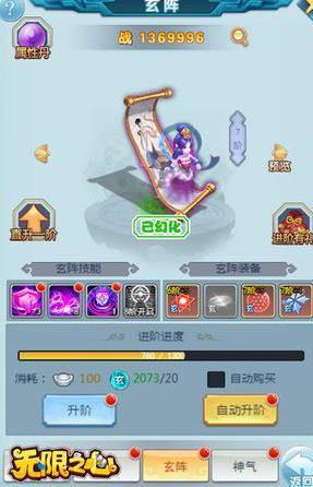 神女虽然强大,但也需要你的悉心培养,才能让她拥有更多的战力更好地帮助你战斗。最简单的方法就是提升神女玄阵和神气,这与天仙和神宠的培养方式类似,同样也是消耗对应的进阶丹进行升阶即可。这两项的等阶提升可以为神女解锁更多炫酷的外型,同时获得大量属性、提升战力,也能让神女装备更高等级的装备、激活对应的技能。