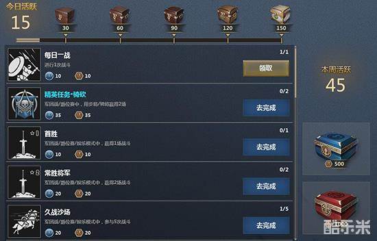 每天上线后看自己的精英任务,如果有150杀敌的任务,玩复活或者攻城是比较好的选择。精英任务是必须完成的,一般随着每天久战沙场任务(玩5局军团或者爵位或者娱乐)完成后,精英任务也完成了。在这个过程中你只需要顺手点赞,运气不太差的话首胜也是可以的,也就是5局玩下来,你一口气做完了4个每日任务。
