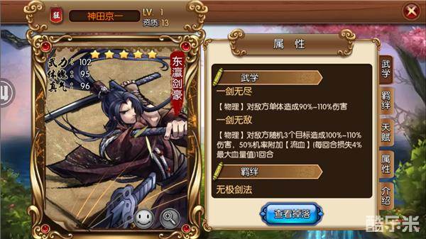 武学特色:无极剑法的大师兄居然没有普攻降怒,有点悲哀。大招散打三人附带机率流血还可以。