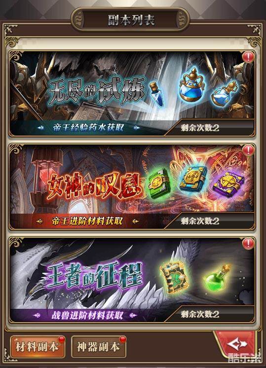 然而,通过的关卡越多,后面我们面对的关卡难度也就越来越难。此时我们需要提升自身以及帝王的战力,才能更好地面对难度更高的关卡。提升角色及帝王的综合实力,我们需要大量的升级及进阶的材料。这个时候,就是我们在材料副本当中大展身手的时候了!材料副本是获取各种升级、进阶材料的主要途径。其中包括了帝王升级材料、帝王进阶材料、战兽进阶材料等多个副本。