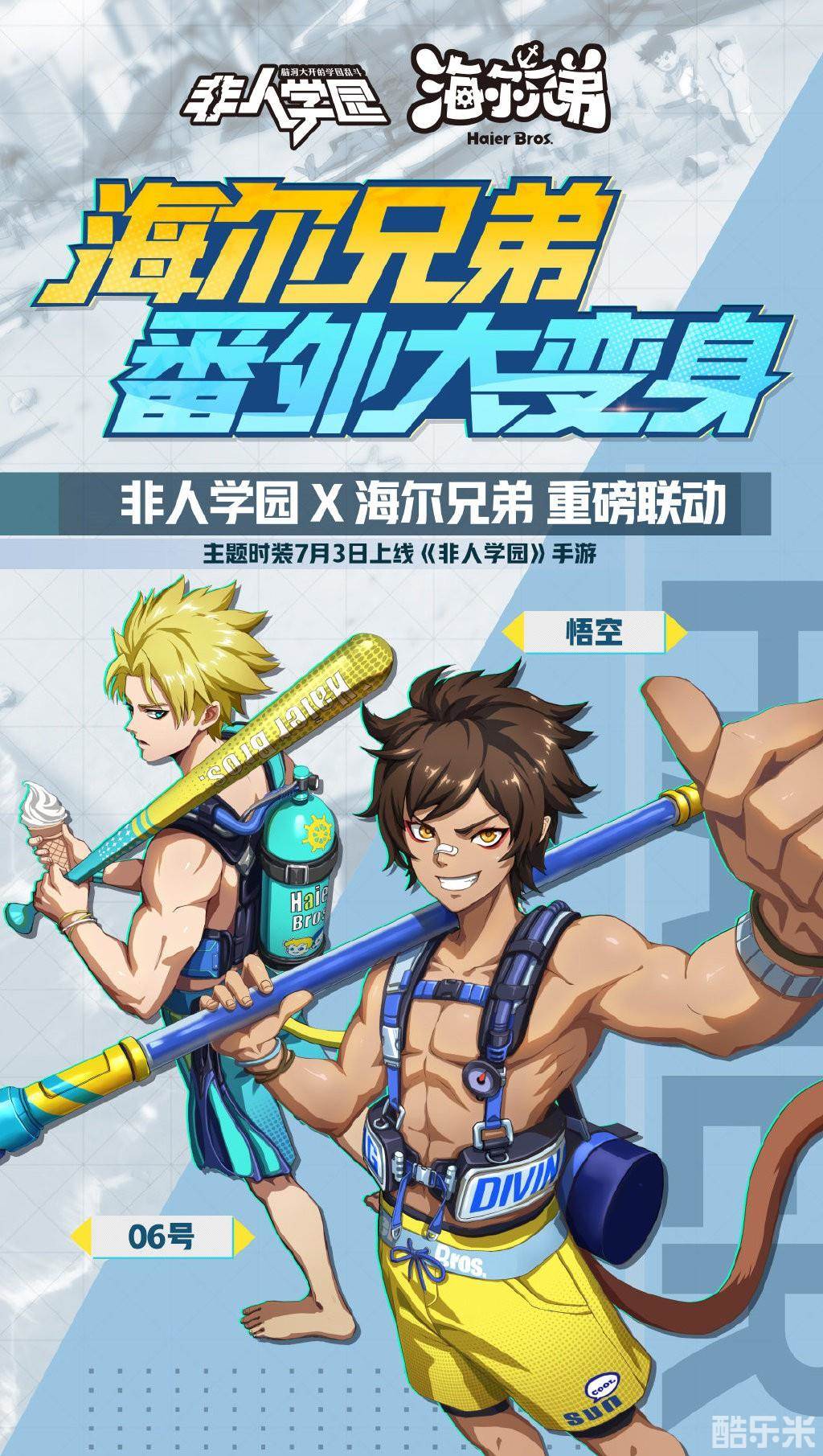 周年庆典狂欢来袭,非人学园x海尔兄弟联动时装清爽上线。悟空与06号,化身海尔兄弟,换上了清凉泳装,朝着大海出发。时装以泳裤作为设计基础,并进一步追加了更显硬核的潜水装备,氧气瓶上还印着“Haier Bros.”字样与海尔兄弟头像。悟空的造型,有着黑色短发、黝黑皮肤、柠檬黄沙滩裤,一眼看上去就是海尔哥本哥。06号作为海尔弟,则是金黄短发、白皙的皮肤、水蓝色沙滩裤,连手上拿着的冰淇淋都安排得清清楚楚!战场上,两人的特效也都带上了清凉的海蓝色,一招一式中,各种贝壳、海螺、海星四散飞舞,充满了夏日大海的味道!