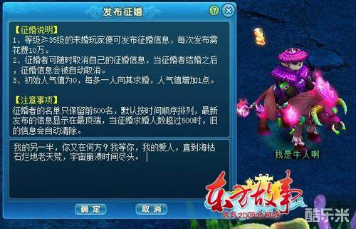 秀恩爱,秀浪漫,秀青春,秀个性。《东方故事》独具魅力的姻缘薄系统今夏甜蜜出击!作为一个集征婚、求婚为一体,供东方恋人们相识相知的浪漫平台,姻缘薄自上线之初便倍受少男少女们的喜爱。若你在婚姻薄中成功发布了征婚信息,不仅可以让所有异性看到你的个人资料,更可展示你精心谱下的爱情宣言,字字动人,句句深情,怎能不引人心动?若在姻缘薄中相中了你的意中人,送TA一朵鲜花,大胆说出你的爱吧!作为你的意中人,则会以邮件的形式收到这份情真意切的礼物。悸动的年华,青春的岁月,修仙之路有你不再孤单!