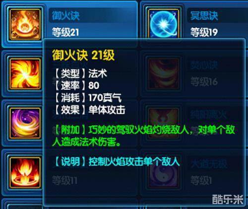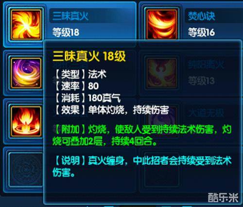 这个技能属于单体持续伤害技能,爆发起来比较慢,使用后4回合内持续掉血。比如前面我们所说的假设御火决攻击1400血,而使用三味真火的话就可以达到2100血左右的伤害,伤害是比较客观,但是使用的时候也会有局限性,相对更适用于擂台PK切磋的时候使用。
