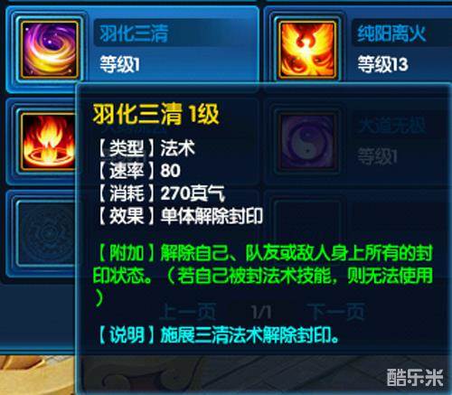 这个技能是解封技能,不过自己被封印的时候就不能用了,比较适用于多辅助的队伍。当你感觉你的队伍里负责封印的小伙伴没有对面负责封印的小伙伴的速度快时,对面的封印一定会先封印住你方的封印玩家,这个时候我们就可以直接使用羽化三清技能了,建议同队伍的小伙伴要多多进行配合与磨炼,这样才能更好的发挥出技能的威力。