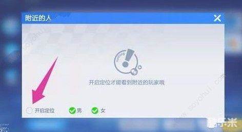 然后点击进入“附近的人”,会需要玩家们开启自己的定位,然后还能设置需要查看的附近的人的性别。