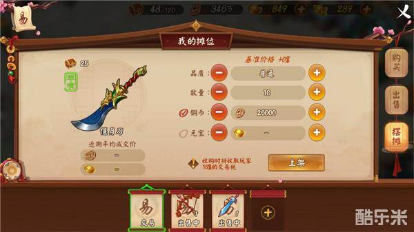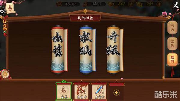 点开交易行的摆摊功能会出现三个卷轴,点击出售,玩家可以将自己以有的装备进行贩卖。