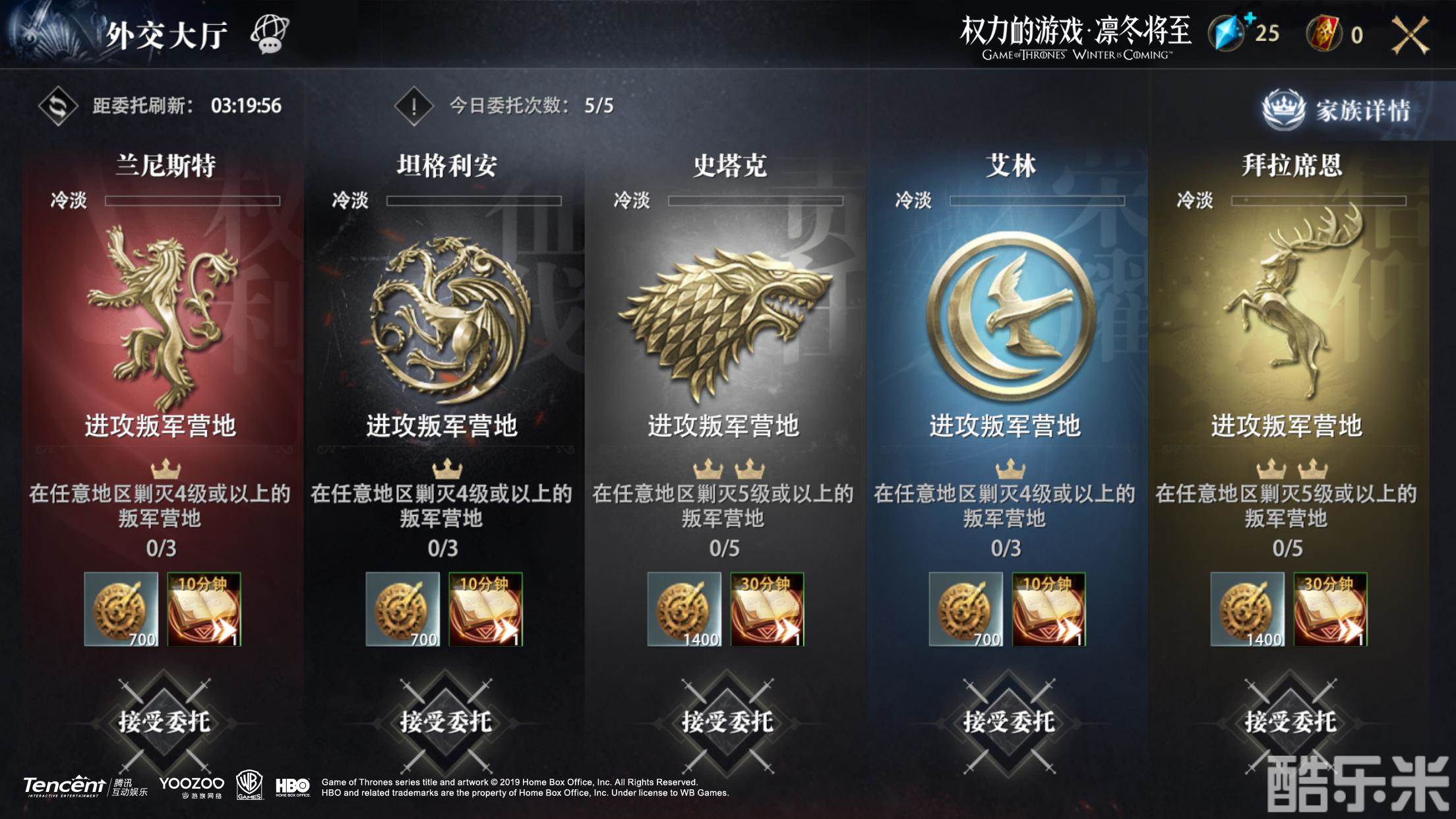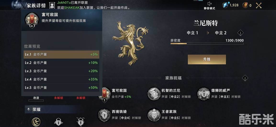 在《权力的游戏 凛冬将至》手游“家族外交”玩法中,玩家可以通过与五大阵营的15个家族积极发展关系,通过完成各大家族的委托任务,能够获得各大家族的友好值,通过友好值的提升,能够获得各大家族给予的buff加成及任务奖励。不同的家族会给你带来不同的祝福效果。举个例子,兰尼斯特家族的祝福包括“富可敌国”、“机智的兰尼”、“雄狮的威严”、“西境铁骑”和“王者家族”;“富可敌国”祝福可让你获得金币产量加成,最高可达到50%的加成效果。