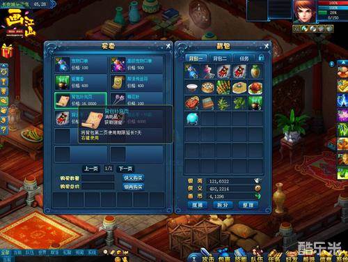 任务背包暂且不谈,“背包一”能装下35个(组)道具,一般来说是不太够用的,怎么办呢?你一定已经发现了玩家身上其实还有一个“背包二”,但是这第二个背包在一般情况下是禁用的,想要开启的话,就必须到杂货店里购买“背包补充页”,一张背包补充页能让第二个背包的使用权限延长7天。