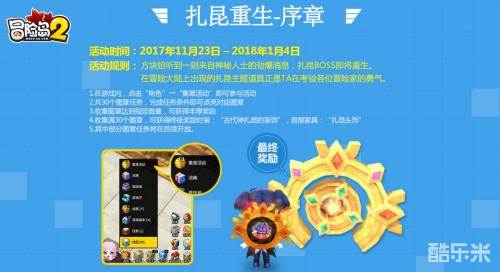 强大的扎昆BOSS即将再次降临冒险大陆,想要证明自己的的勇气,就要在2017年11月23日至2018年1月4日期间,收集齐30个指定活动图章,赢取扎昆主题道具。通过活动考验的冒险家在获得丰厚的任务奖励的同时,即可免费领取“古代神扎昆的装饰”时装奖励和“扎昆头饰”房屋家具。