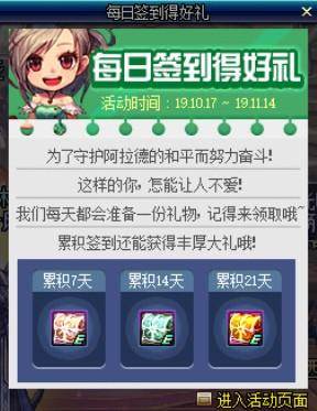 该活动分为每周签到和累积签到,每周签到形式是每周过关3次推荐地下城,可以得到凯丽的强化器或者是便携式锻造炉。