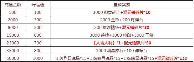 【活动内容】活动期间可通过充值金币获得好运值,积累好运值即可打开宝箱奖励,闪耀称号,全新神器,绝对超值的提升战力资源,尽在特惠好礼。
