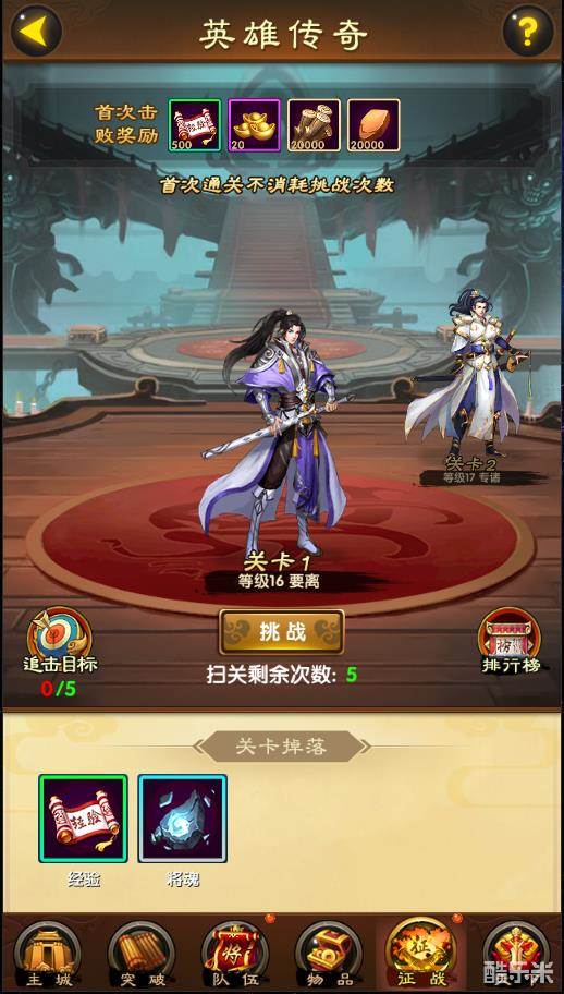 挑战条件:主公到达18级开启副本的1-5关,20级开启6-10关,25级开启11-15关,以此类推。