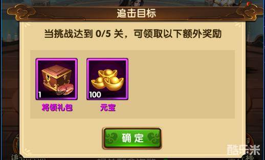 当挑战关卡达到一定数量,还可在追击目标里领取额外赠送的将领礼包和元宝奖励。将领礼包内包含同学派的紫色将领碎片6张。