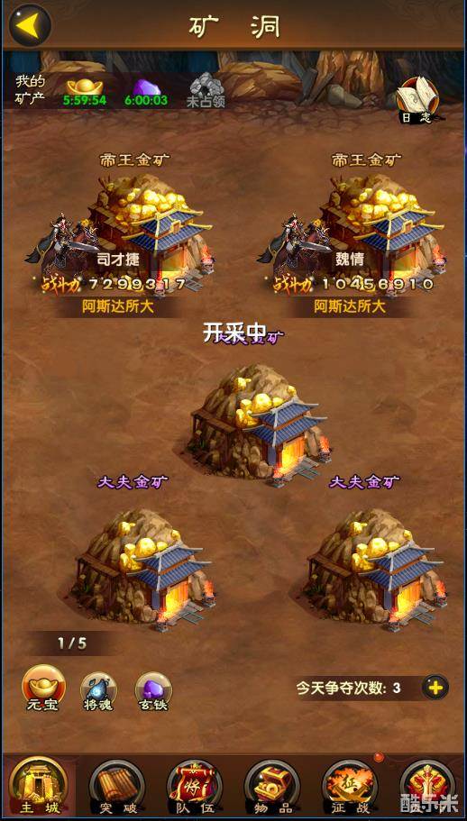 在矿洞上方会显示主公目前正在采集哪些矿洞,以及所剩余的时间,这个时间是可以延长的,只要无人去抢夺,就能保证长时间在线采集。在矿洞的日志内,可以查看到抢你成果的小偷,去尾随他报复吧!