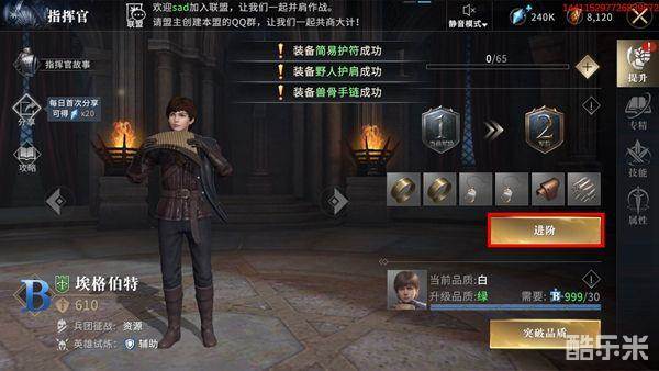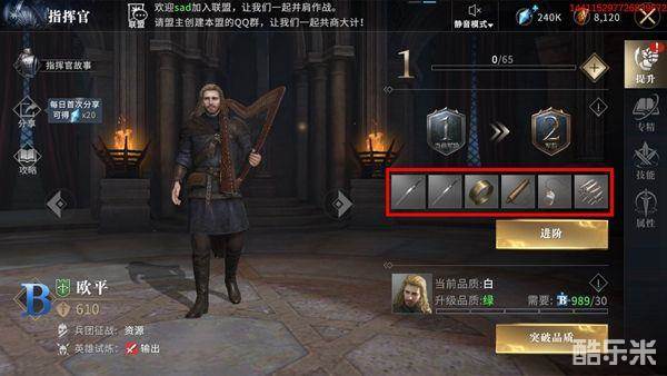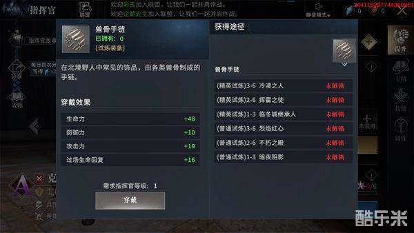 在提升指挥官军阶时,领主需要为指挥官穿戴对应的指挥官装备。不同的指挥官在升阶时对装备的需求也会有所不同,比如欧平从1阶进阶到2阶时,需要穿戴北境匕首*2、古朴戒指*1、战士手记*1、简易护符*1、兽骨手链*1。