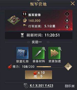 选中当前可征伐的叛军后,点击即可打开叛军营地界面。叛军营地界面中有叛军信息、刷新倒计时、奖励介绍、精力以及战斗按钮。