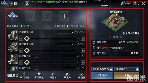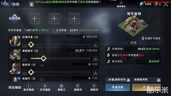 同时右侧的叛军数据中还可查看行军时间,并设置阵型。