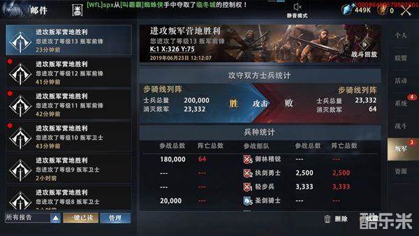 领主每进行一次叛军战斗,都可在邮件-叛军中查看站东路详情。其中包括战利品、战斗情况。