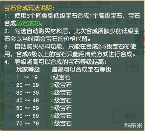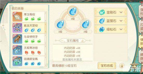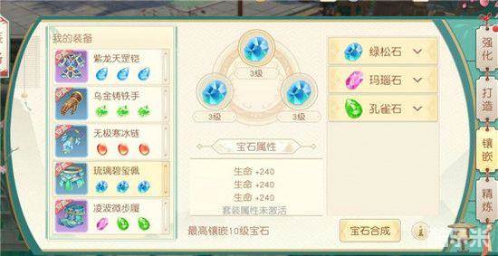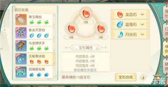 3颗低级宝石=1颗高级宝石(低级宝石不够的情况下可在商会选择自动购买,用金币代替宝石)。在更换装备的时候可以将宝石无损耗的继承到新装备上,这样可以大大方便了玩家,不用手动更换宝石。可镶嵌宝石数量也是和装备可穿戴等级有关的,所以小伙伴们快快提升吧。