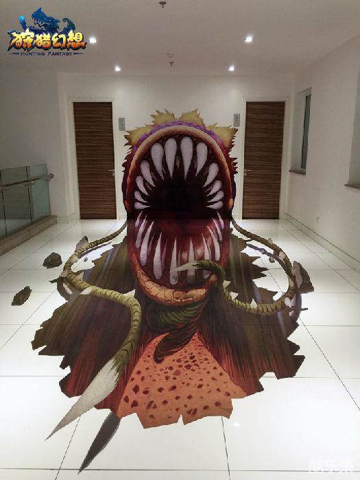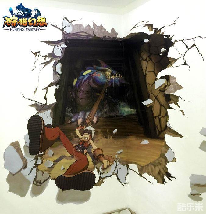 涂鸦墙虽然好看,却只是《狩猎幻想》员工“巢穴”中的一景而已。为了创造出一个更加逼真的原始世界,极光互动还特意为“惊吓”员工而打造了两面充满视觉震撼力的3D墙。每次走近,都会让人产生即将穿越荒兽巢穴的错觉!