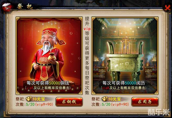 每天有一定次数可以向财神祭祀,求取铜钱,求铜钱的过程中有可能获得暴击的机会。财神会额外给你发送更多的铜钱哦!每天能求取铜钱的次数是有限的,开通VIP能获得更多的求铜钱次数呢!