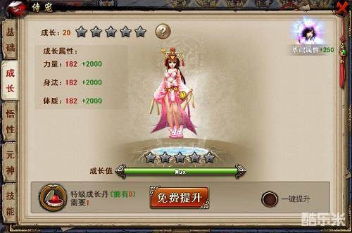 5、 侍宠成长32级开启,每天有1次免费提升次数,提升成长获得1级属性增长