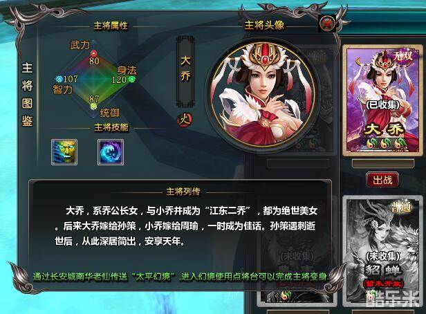孙策的妻子,与妹妹小乔一起并称二乔,是天下不可多得得美人。主将技能是国色,能够将范围内所有敌方角色眩晕。并削减防御力。