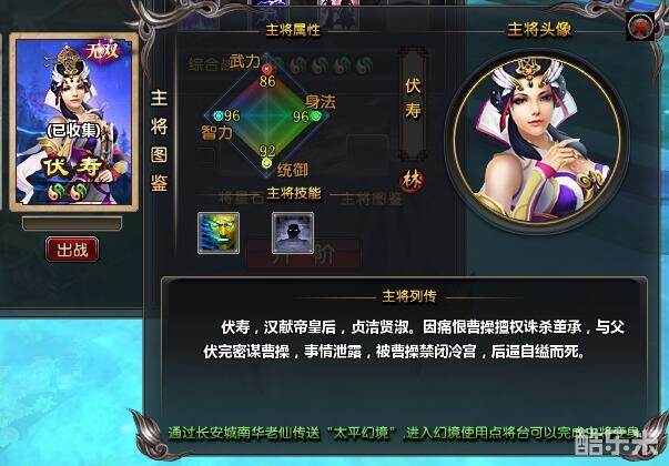 汉献帝皇后,母仪天下,与父亲付完密谋诛杀曹操,事情泄露,被曹操幽闭冷宫。主将技能是悲鸣,范围内大幅减弱敌军移动速度。