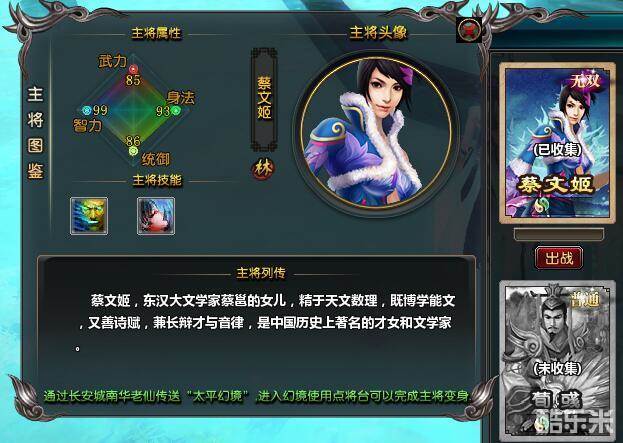文学家蔡邑的女儿,文采无双,精通诗赋,曹操非常仰慕的女子,是一位冰山美人。主将技能为悲歌,能够大幅度增加玩家的防御力和统御。