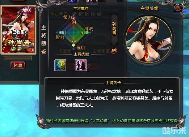 孙权的妹妹,从小弓马娴熟,不爱红装爱武装。作为江东与蜀汉结姻的牺牲品。孙尚香的主将技,结姻,能为范围内的所有友军回复大量的生命值。