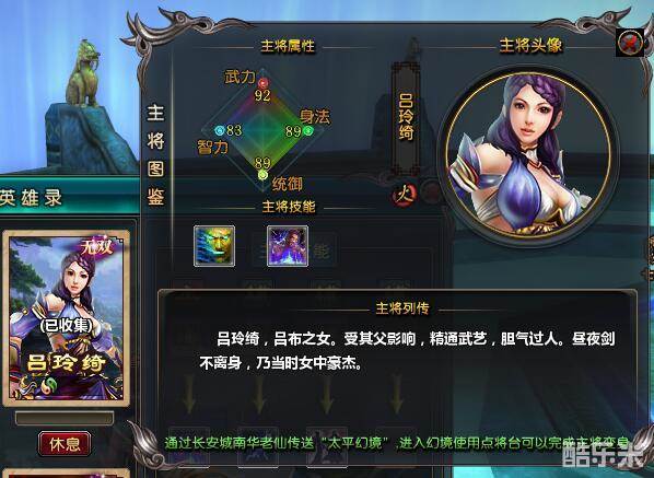 吕布的女儿,秉承父亲的风格,行事如飙风迅雷,势不可挡。主将技增加玩家30%的暴击,1000点命中。非常契合猛将职业高爆发的特性。