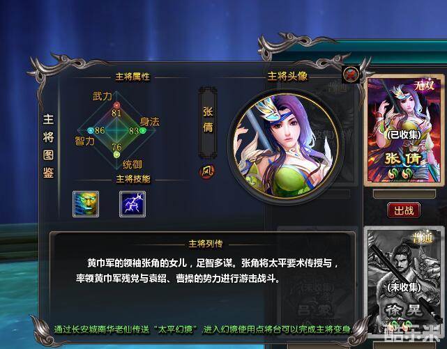张角的女儿,足智多谋,而且继承了张角秘诀《太平要术》,能够呼风唤雷。主将技能够操纵雷电,大幅度削减敌人的防御和移动速度。