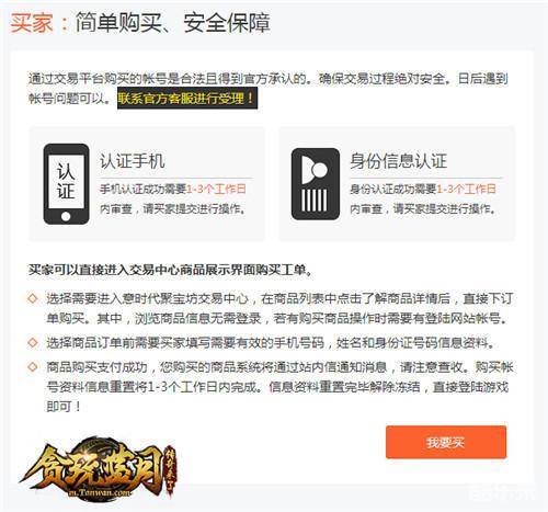 “意时代聚宝坊”是官方认可的游戏线下帐号买卖交易平台,为满足游戏里玩家帐号买卖交易需求应运而生。它可以保障贪玩游戏里每位玩家的利益,帮助贪玩里的每一位玩家远离游戏骗子,并打击盗号者非法销脏的行为。在官方交易平台各位玩家的每一单交易都会很方便。交易凭证合法性存在,交易全程由官方工作人员监督、交易安全、交易完成官方工作人员将会帮助买家重置帐号资料确保日后帐号使用安全得到保障。