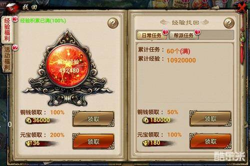 4. 领取找回的任务经验可以选择铜钱领取或元宝领取,铜钱领取只能领取50%经验,元宝领取可领取100%经验;