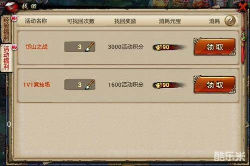 1. 邙山之战、1V1竞技场当天没有参与,则次日可以找回一定量的积分;