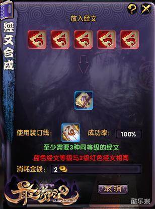 相同等级的经文可以合成经文卷,通过经文卷可以随机抽取高等级的经文。要合成经文需要相同等级的经文至少3个,放入的经文越多合成的成功率也越高,另外若置入经书装订符,将会额外提升25%合成机率,另外合成将会收取金钱费用。