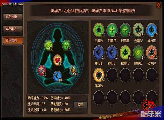玩家通过“真气领悟”可获得真气,真气共有六种,分别提升状元的治疗能力、伤害能力、生命回复、移动速度、生命上限及防御能力。