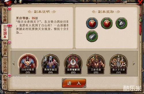 2. 白山村除恶:35级开启,每天进入次数,3次。副本奖励:高级女儿红,中级女儿红,初级强化石,4阶玄铁。