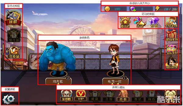 系统功能区有英雄殿、成就(任务成就)、升级、背包、强化、商店、战队,对玩家操作有个很直观的展示,玩家可以在里面查看所有英雄,可以对所拥有的英雄进行强化升级等等。