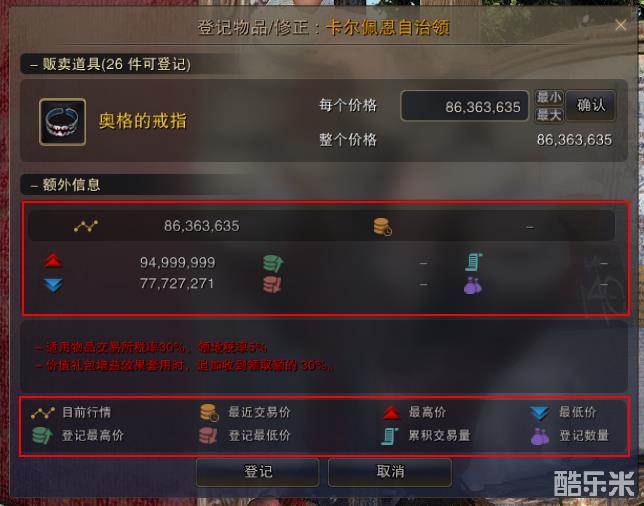 并且每一类商品的市场最高价与最低价,目前登记数量,累计交易量,系统估价等都可以从拍卖页面一一查看。