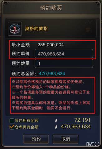 如果拍卖市场某一样商品非常稀有,但你又非常想要。那么便可以通过预约系统购买,以高于市场价的价格去预约购买相应的物品。确定预约后系统会帮你购买,当然只要保证银行里的余额够便可以了。