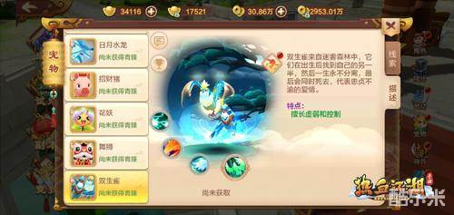 先看下他们的外形,可以说是《热血江湖手游》推出以来最特别的一只,双生造型,完全可以看做是买一只宠物得两位守护,不管是作战还是日常行走江湖,都会格外吸引眼球。相思雀擅长虚弱和控制,运用得当绝对可以出奇效。